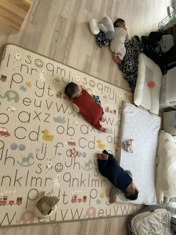 なんと、見事にバラバラの場所、そしてバラバラの寝相で眠る3つ子ちゃんたち!その見事なまでの「非シンクロ」ぶりが、なんとも微笑ましく、そして面白いですね。1人に至っては、マットからもはみ出してしまっています。きっと最初は近くで寝ていたはず…?それぞれの自由すぎる寝相に、確かな個性を感じて愛おしくなります。