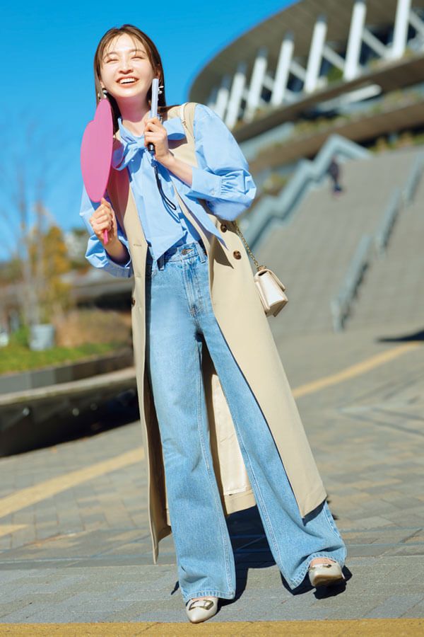 ショートコートとジレにもなる3WAY仕様のトレンチコートを分解して、ロングジレとして活用。トレンチ見えするジレがあれば、デニムもこんなによそいきモードに♡ 斜め掛けできるバッグならライブ中もストレスフリー!