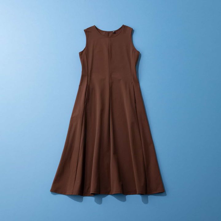 こちらのワンピースは形が綺麗で、ノースリーブですが肉感を拾わずに着られます。撥水機能もあり、普段使いにもピッタリなので、梅雨〜真夏にかけて使えますよ。