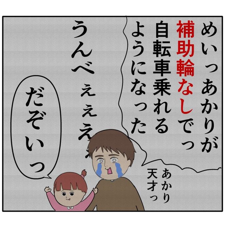 あかりちゃんが成長すると、ろみ緒さんはあかりちゃんに自転車の乗り方を教えました。練習を重ねあかりちゃんが補助輪なしで自転車に乗れるようになると、ろみ緒さんは感動で涙を流しながらめいさんに報告し、一緒に喜びを分かち合いました。