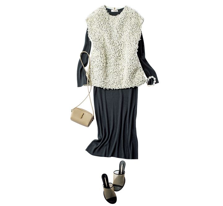 カラミリボンブラウス¥49,500〈エッフェ ビームス〉ニットワンピース¥27,500〈デミルクス ビームス〉ミニショルダーバッグ¥24,200〈トフ アンド ロードストーン × デミルクス ビームス〉サンダル¥69,300 〈ブレンテッラ〉ブレスレット¥36,300〈モスキート〉イヤリング¥9,900 リング上¥8,800〈ともにデミルクス ビームス〉リング下¥22,000〈フリュイジョリ〉(すべてビームス ハウス 丸の内)