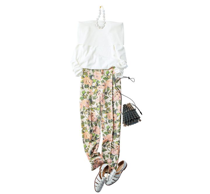 オフショルダートップス¥17,600 グルカサンダル¥26,400〈ともにデミルクス ビームス〉パンツ¥47,300〈エッフェ ビームス〉 カットワークショルダーバッグ¥28,600〈メアリ・オル・ターナ〉チョーカー¥42,900〈モスキート〉リング右¥26,400〈フリュイジョリ〉リング左¥8,800〈デミルクス ビームス〉ピアス¥29,700〈アユス〉(すべてビームス ハウス 丸の内)