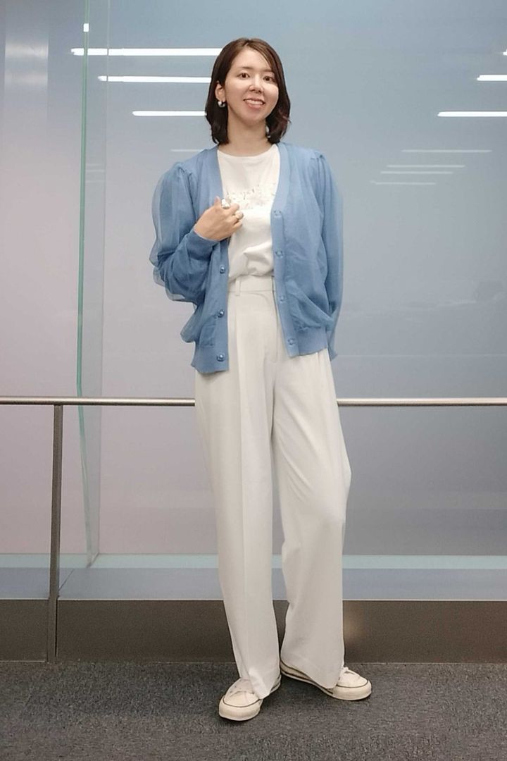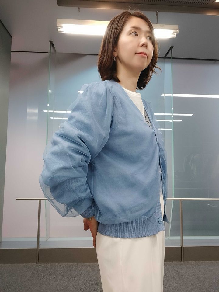 2.トレンド感満点!ホワイトコーデ×ブルーチュールカーディガン