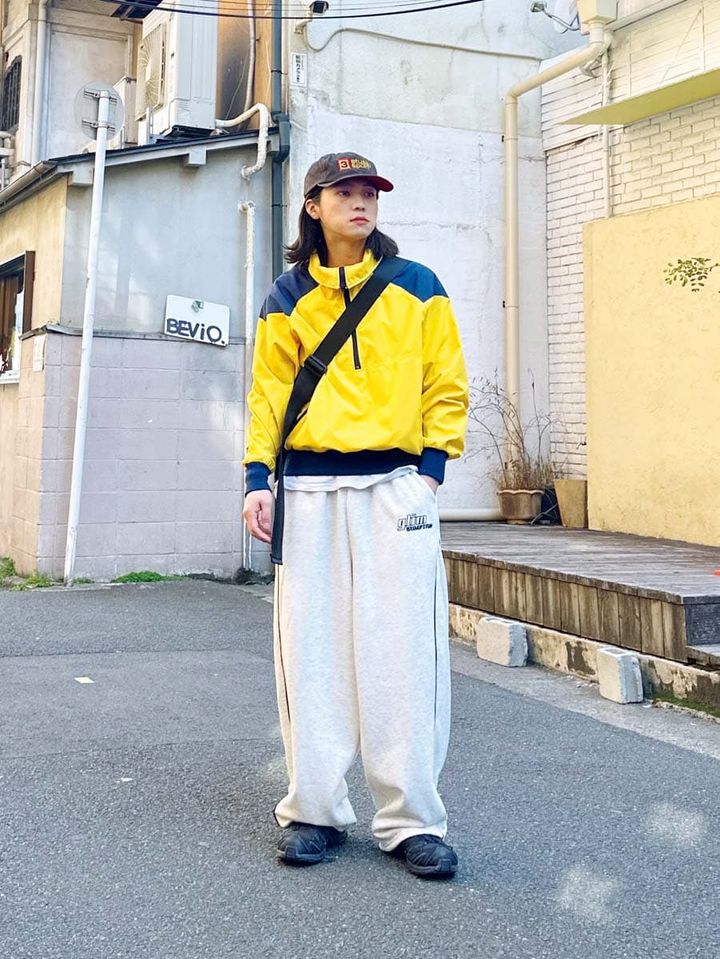 ボトム¥5,499、バッグ¥4,399/ともにウィゴー、古着のトップス、古着のキャップ、サロモンのスニーカー/以上すべて本人私物
