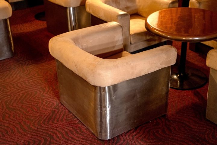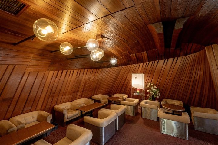 きらびやかな1階の雰囲気から一転、2階の喫茶室は仄暗く静かな空間。巧みに配された間接照明が、重厚な内装を浮かび上がらせます。