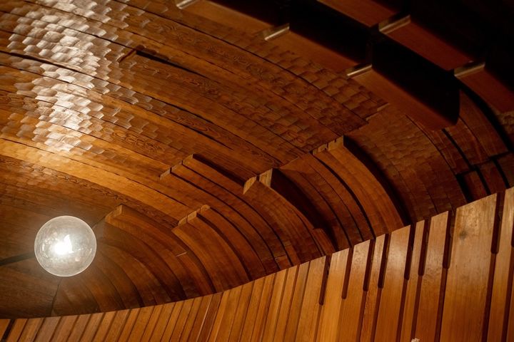 とくに特徴的なのは店内奥の天井。時を経て飴色に変わった無垢板が、壁から天井にかけて弧を描くように覆い、天井の板には“なぐり”(木の表目に凹凸をつける加工)が施されています。