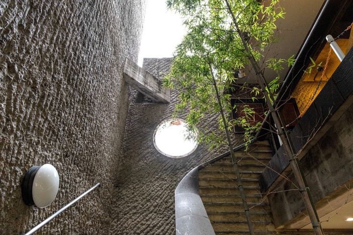独創的なビルは京都の建築家・三澤博章の設計によるもの。「船」をモチーフにデザインされた、鉄筋コンクリート4階建て。昭和44年(1969)の建築です。当時(1960年から70年代)は装飾を不要とし、合理性や機能性を重視した建築デザインが主流。そんななか施主の「ぎおん石」オーナーから求められたのは「もっと“手”を、巧みな手を」入れることだったそうです。