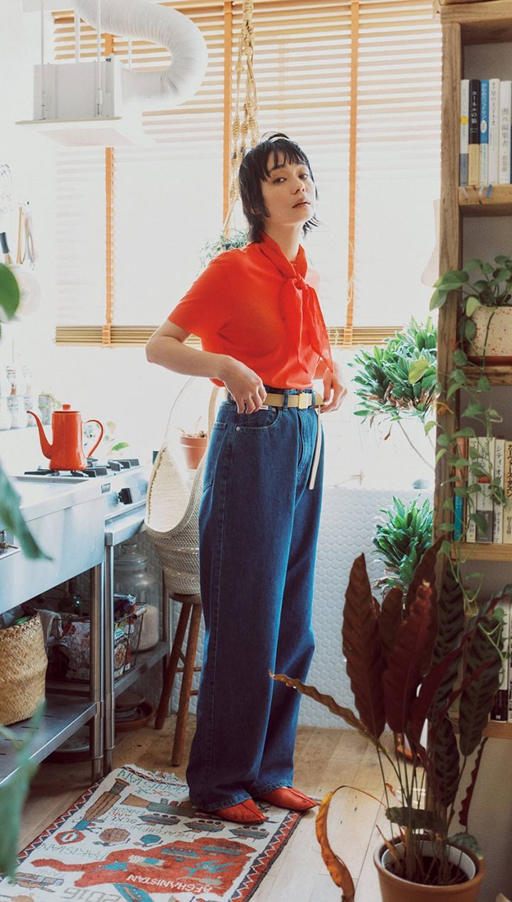 デニムパンツ¥28,600(ザ シシクイ)、Tシャツ¥16,500(カルバン・クライン/カルバン・クライン カスタマーサービス)、スカーフ¥22,000(BLECK※別注/ビー エディション ニュウマン新宿店)、ベルト¥20,900(アトリエ アンボワーズ/アマン)、バッグ¥88,000(アイディ/ビオトープ)、シューズ¥24,200(デ・プレ)