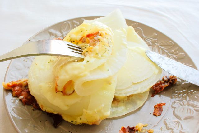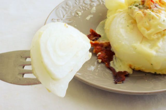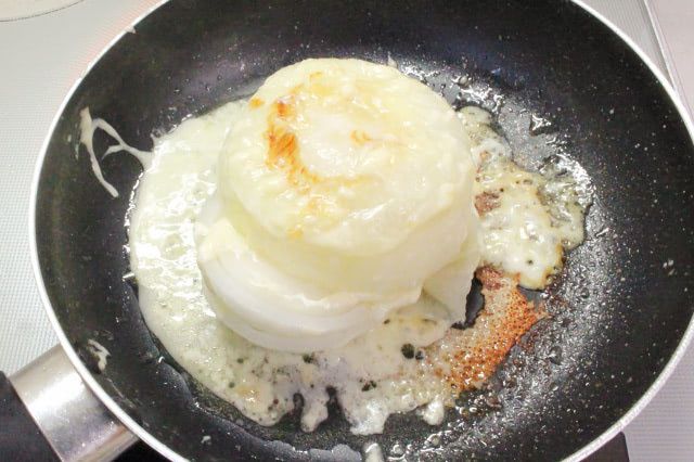 新玉ねぎもチーズも同じような白っぽい色なので、画像では確認しづらいのですが、傾いた新玉ねぎの方に溶けたチーズがかかっていますよ。