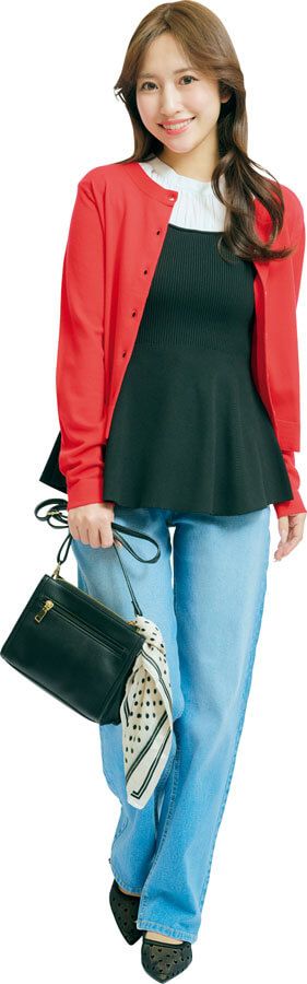 引き続きトレンドの赤をきれいめカーデでもってくることで、カジュアルなモノトーンルックをエレガントに昇華。ペプラムデザインのトップスやパンプスのハート柄で曲線を、デニムやバッグで直線を取り入れることで、より美人さに拍車をかけています。