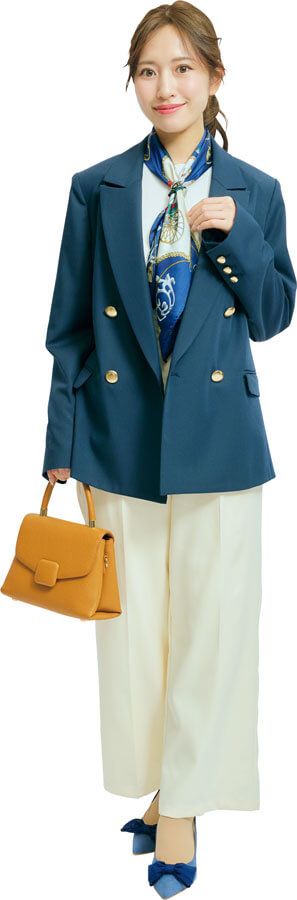 コントラスト強めのネイビー×白のコーデも目鼻立ちがしっかりとしたタイプなら威圧感なく、おしゃれ上級者見え。ジャケットと同色のスカーフ合わせで、美人ムードを際立てて。