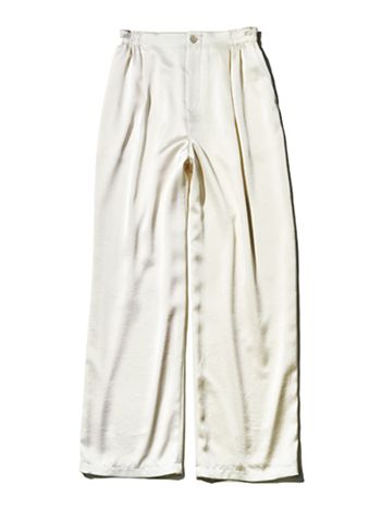 サテンパンツ/ベッド&ブレックファスト(グリードインターナショナル) 「やわらかな光沢のあるサテンパンツ。深めのタックとウエストボタンのおかげでリラクシーに傾きすぎないのもGOOD」(岩田さん)