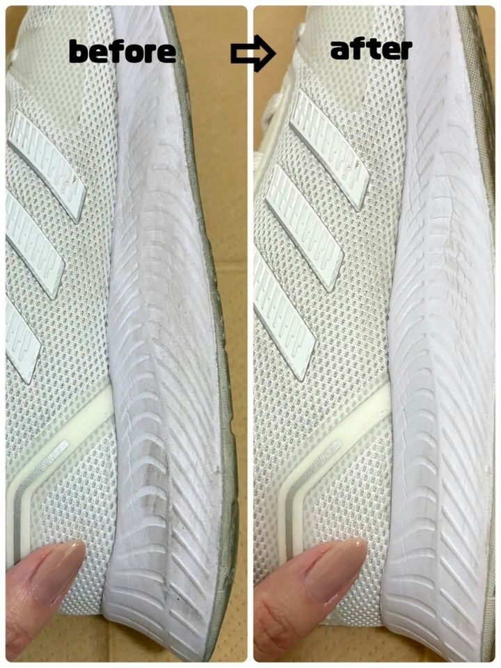 ビフォーアフターの写真を見ると、靴の側面や底部分の汚れが落ち、本来の白さが蘇っているのがわかります。部分的な汚れが落ちるだけでも、靴全体の印象は大きく変わりますよね。