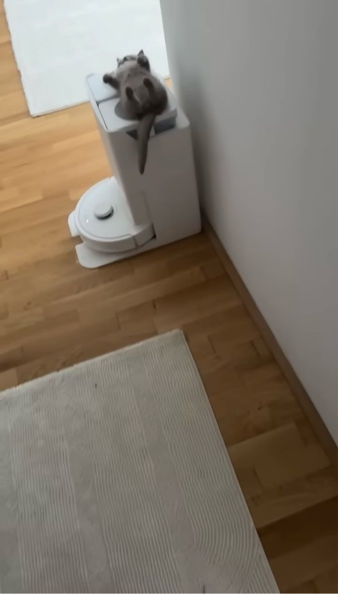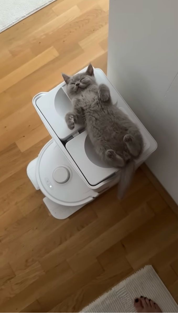この子が寝床に選んだその場所は、なんとロボット掃除機の充電ステーションの上でした! よく見ると、ロボット掃除機がスタンバイしているのも確認できます。