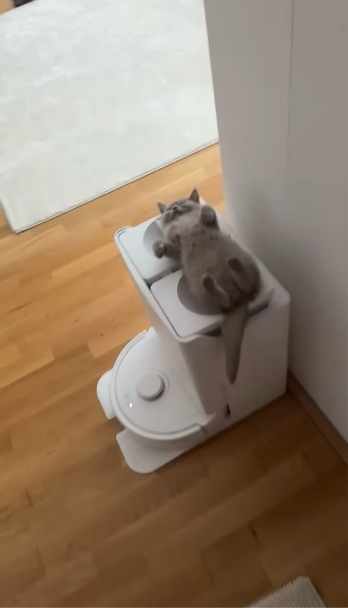 ロボット掃除機の充電ステーションの上でお昼寝していたネコ。 その穏やかな様子は、こちらの動画からご覧いただけます。