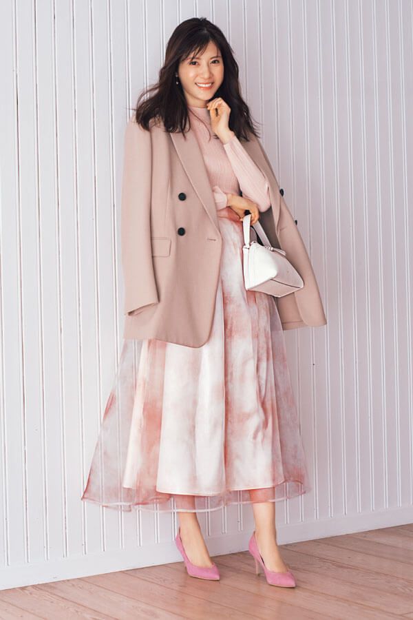 光沢感のあるオーガンジー生地でリッチ見えするニュアンシーなスカートに、顔色が明るく見える桜カラーのニットをON。マニッシュなベージュのダブルブレストジャケットを肩がけして、きちんと感をプラスして。程よいオーバーサイズとボクシーシルエットがピンクの女性らしさを引き立てます。