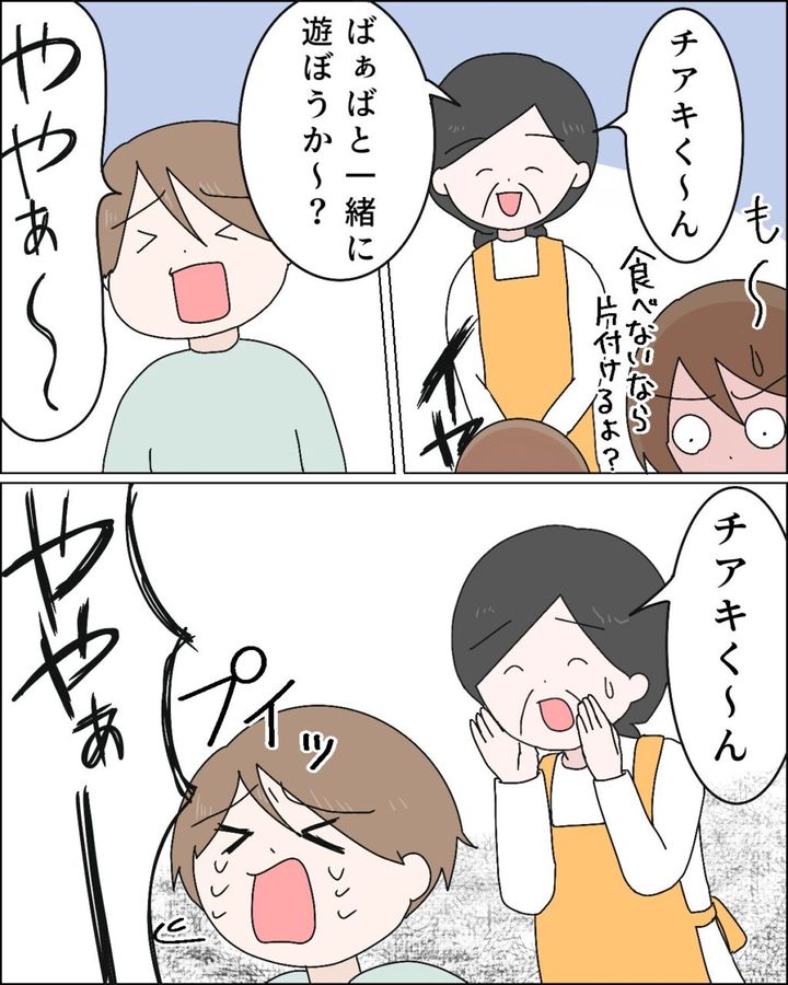 義母がチアキの相手をしようと何度も声掛けをしてくれましたが「イヤ」に拍車がかかるチアキ。とうとう泣き出してしまいました。
