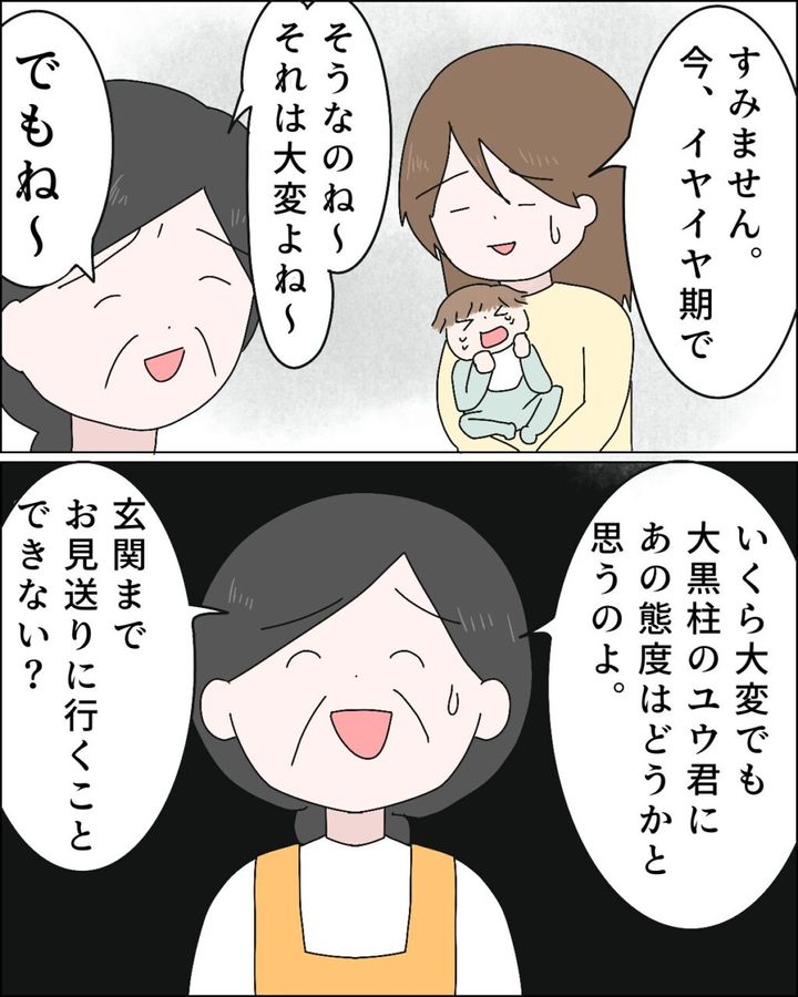 3. 夫を玄関まで見送らない態度が不満な義母がイヤイヤ期と乳児を抱える嫁に小言。家で一番偉いオレ|ママ広場マンガ