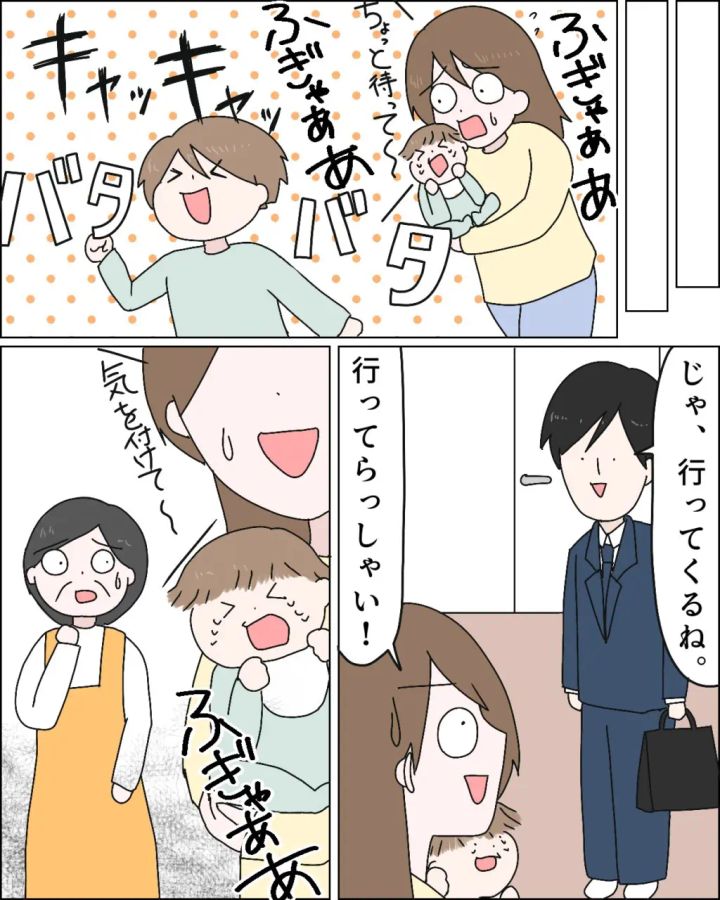泣き止まないナツキを抱え、走り回る2歳のチアキを追いかける私。「行ってくるね。」と言って会社に出かけるユキヒロにバタバタしながら「行ってらっしゃい!気をつけてね~」と声をかける私たちの朝のルーティン。でも、その様子が義母には信じられなかったようです。