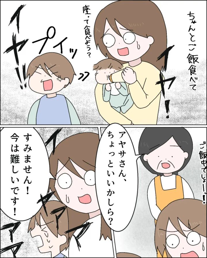 玄関から戻った義母に「ちょっといいかしら?」と声をかけられましたが、絶賛イヤイヤ期のチアキになんとか朝ご飯を食べさせようと奮闘中の私は「すみません!今は難しいです!」と答えました。いや、見たらわかるよね?と心の中では叫びましたが。