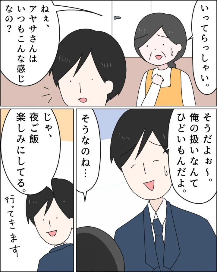 ユキヒロを玄関まで見送りながら「ねぇ、アヤサさんはいつもこんな感じなの?」と心配そうに聞く義母に「そうだよぉ~。俺の扱いなんてひどいもんだよ。」と言って出かけて行ったユキヒロ。義母の作る夕飯が楽しみなようです。