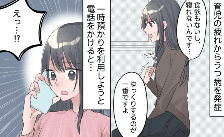 現在、5歳と2歳の娘を育てている専業主婦です。育児の疲れからか、数カ月前から突然涙が出る、眠れない、食欲がわかないなどのうつ病の症状が出て、病院に通っています。うつ病を治すには「ストレスになることをしないでゆっくりするのが一番」と担当医から言われましたが、子どもがいるとなかなかゆっくりできません。そこで上の子が幼稚園に通っている間、下の子を保育園の一時預かりに預けてみようと思い、電話をかけたのですが……。