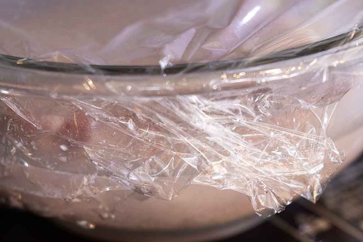 2、熱湯を注ぎ、ふんわりラップをして電子レンジ(600W)で10分加熱。そのまま1時間ラップをしたまま放置して火を通す。