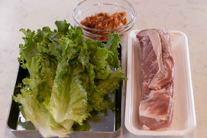 4、粗熱が取れた豚肉を1cm幅に切り、皿にサンチュ・キムチ・つけだれとともに盛り付ける。包んで食べるスタイルで召し上がれ。