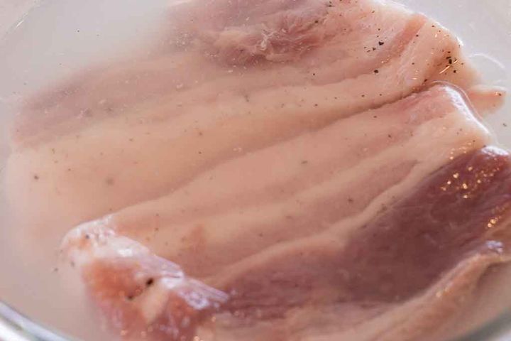 1、 豚バラ肉はフォークで全体に穴をあけ、耐熱ボウルに入れる。<A>を加えてもみ込み、下味をつける。