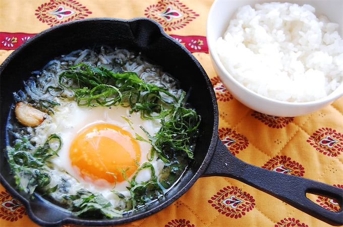 忙しいときにパパッと済ませたい"おひとり様ご飯"は、手早く簡単!これに限ります。YouTubeチャンネル『kattyanneru/かっちゃんねる』で紹介しているのは、まさにそんなレシピ。スキレットでにんにくと一緒に温めた、たっぷりのオリーブオイルに卵を割り入れ、しらすと青じそを散らすだけ。「しらす卵アヒージョ」ですって。本日は、それをドン!とご飯の上にのっけて、アヒージョ丼にしていただきます♪