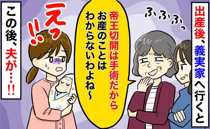 びっくりした私は何も言い返せず……。夫が「帝王切開だって立派な出産だ。術後も大変なのに、そんなひどいこと言うな」と義母に反論してくれました。しかし、義母と義妹は「そう」とだけ言い、まったく響いていない様子。