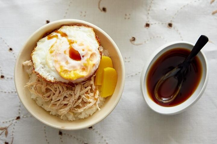 器にご飯を盛って鶏肉を適量のせ、たくあんを添える。たれを1人分につき大さじ1ほどかける。さらに目玉焼きをのせてとろみ醤油をかける。