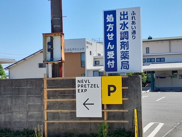 電車通りから出水ふれあい通りを直進すると、右手にローソンが見えてきます。そのすぐ向かい側、左手にある「出水調剤薬局」の看板の下に「NEVL」の看板が!そこが駐車場です。
