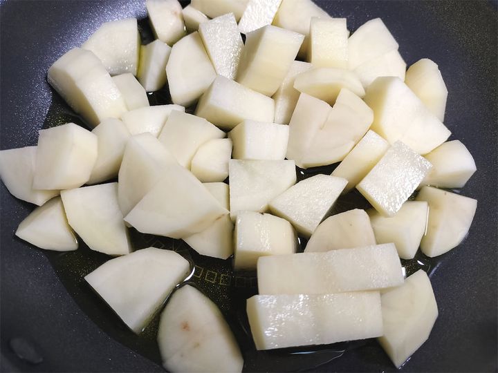 1. フライパンにオリーブオイル大さじ3を引いてじゃがいもを入れ、塩を振って中火で炒めます。