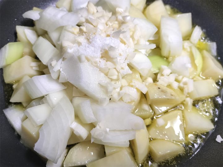 2. 玉ねぎとにんにくを加えて塩を振ります。
