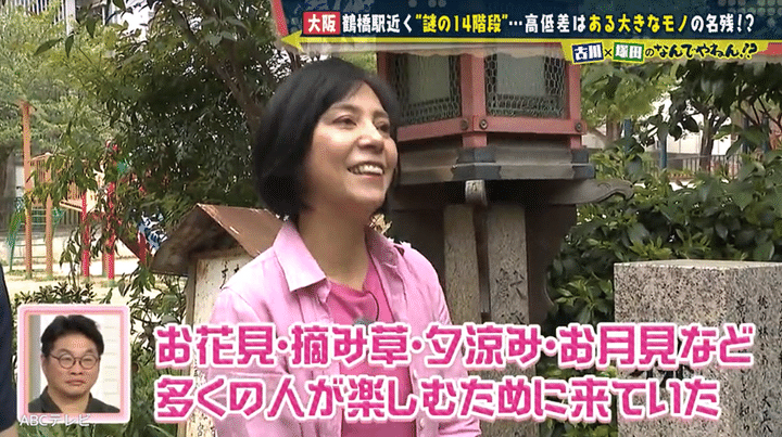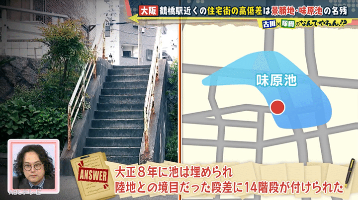 塚田と古川アナが本来訪れるべき場所は、謎の14階段近くの産湯稲荷神社。同神社があった地域には、大阪屈指の景勝地・味原池がかつて存在し、森さんいわく、「お花見、摘み草、夕涼み、お月見など、多くの人が楽しむために来ていた」のだとか。池は大正8年に埋められ、閑静な住宅街へ変わり、陸地との境目だった段差に、謎の14階段がつくられたという。つまり住宅街の高低差は、味原池の名残だったのだ。