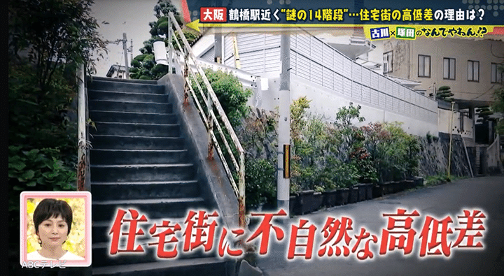 謎の14階段は、JR鶴橋駅から徒歩10分ほどの閑静な住宅街にある。階段の周辺は、高低差が約2.5メートルもある不思議な地形だ。この住宅街の先には、古川アナの母校・大阪府立高津高等学校があり、周辺には謎の14階段よりも長い階段がある。