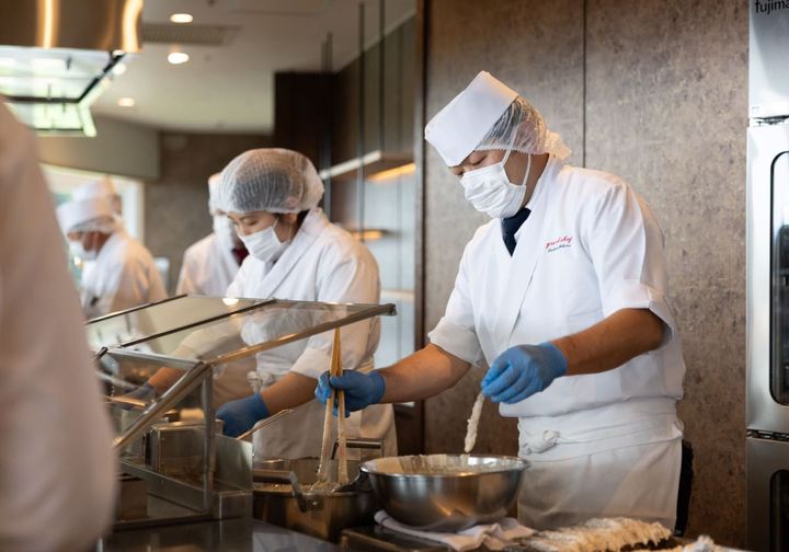 朝食ビュッフェには地元食材を使用した料理が約100品も! 新鮮野菜や上州麦豚の加工品、郷土料理「おっきりこみ」など地産地消にこだわった料理が並びます。シェフが目の前で腕を振るう全長13mのライブキッチンも新設! ライブ感あふれる食体験を楽しめます。