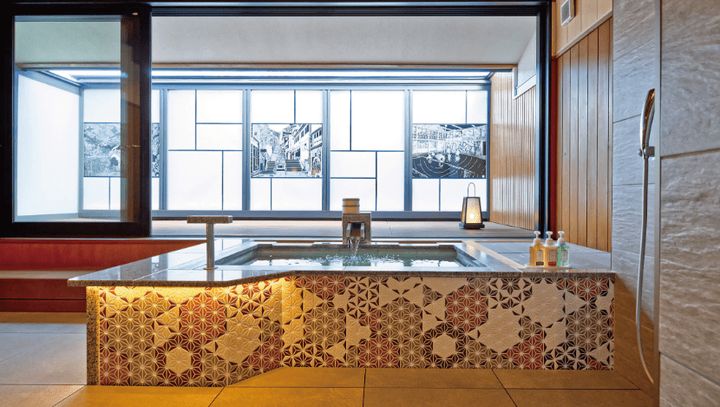 客室の露天風呂には、日本の伝統文様である麻の葉模様のタイルが使用されています。壁面には「ホテル木暮」450年の歴史を切り絵で表現した装飾が施され、アートな露天風呂で湯に浸かりながら歴史と文化にふれることができます。