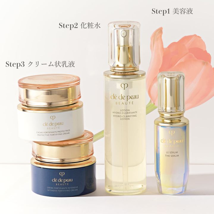 昨年秋に発売された4代目となる「ル・セラム」からSTEPを始める「クレ・ド・ポー」。マドンナリリーの花から抽出された成分とグリセリンをブランドした独自成分が、さまざまな環境ダメージ要因から肌を守る。その後ローション、エマルジョンを重ねることで、濃密な潤いと輝きに満ちた肌へと導く。エマルジョンは紫外線や乾燥から肌を守るデイと、日中に受けたダメージの修復を促すナイトで使い分けを。STEP1:ル・セラムⅡ 50ml ¥29,700、STEP2:ローションイドロC n[医薬部外品]170ml ¥13,200、STEP3:クレームプロテクトゥリス n[医薬部外品]50g ¥13,750、クレームアンタンシヴ n[医薬部外品]50g ¥15,950(クレ・ド・ポー ボーテ)