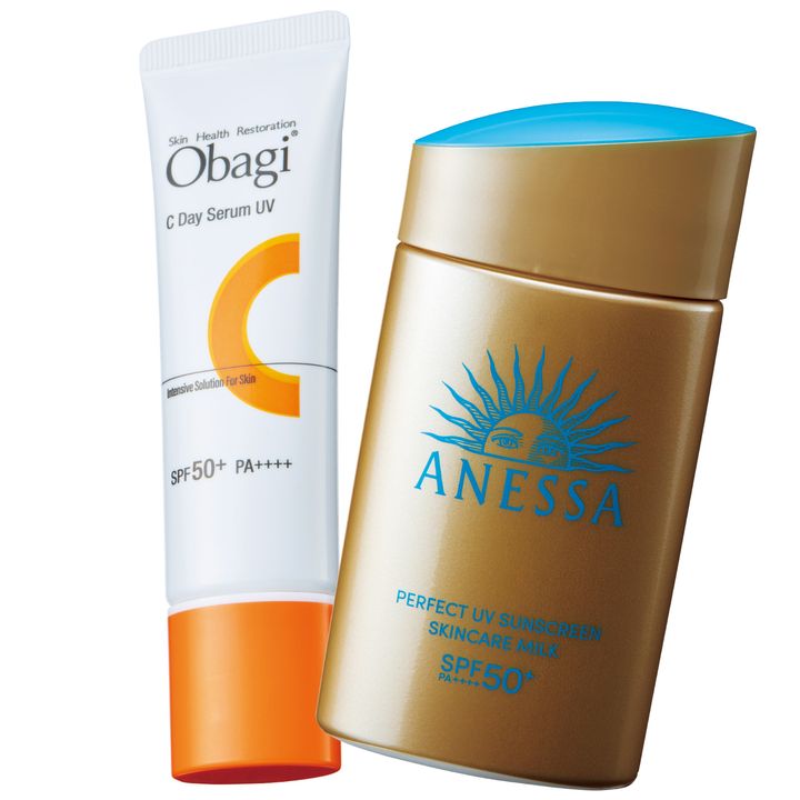 紫外線に反応してビタミンCが溢れ出す、オバジの日焼け止めをアネッサの上に重ね塗りして安心感UP。右/パーフェクトUV スキンケアミルク NA 60ml SPF50+・PA++++ ¥3,058(資生堂)左/オバジC デイセラムUV SPF50+・PA++++ 30g ¥3,300(ロート製薬)