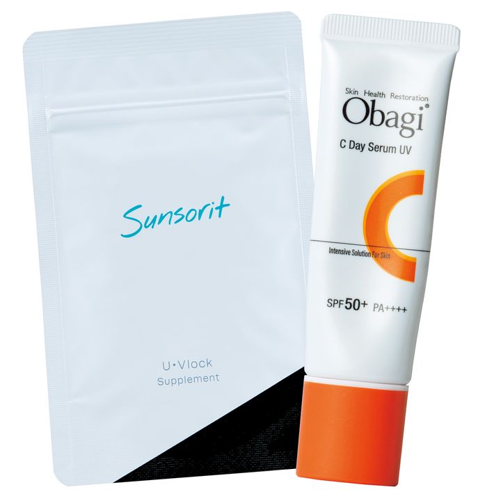 オバジC デイセラムUVはピタッと密着して強力に紫外線をブロック。サンソリットのサプリは1日1粒飲むだけなので簡単にUVケア。サンソリット ユーブロック 30粒 ¥7,020(サンソリット)