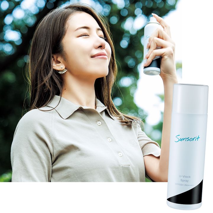 メイクを崩さず広がるスプレーが便利。SPF50+・PA++++なので安心感大。サンソリット ユーブロック スプレーSPF50+・PA++++ 90g ¥1,980(サンソリット)