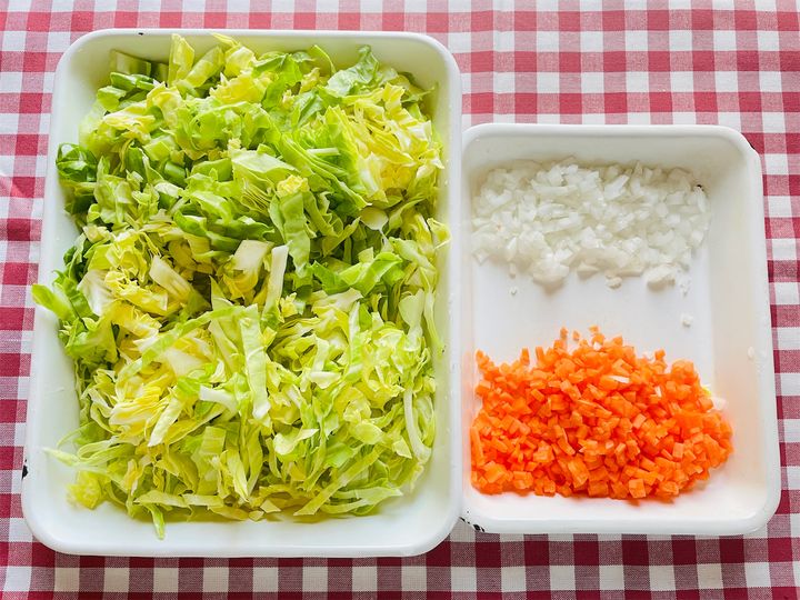 1. キャベツは太めの千切り、にんじんと玉ねぎはみじん切りにする。