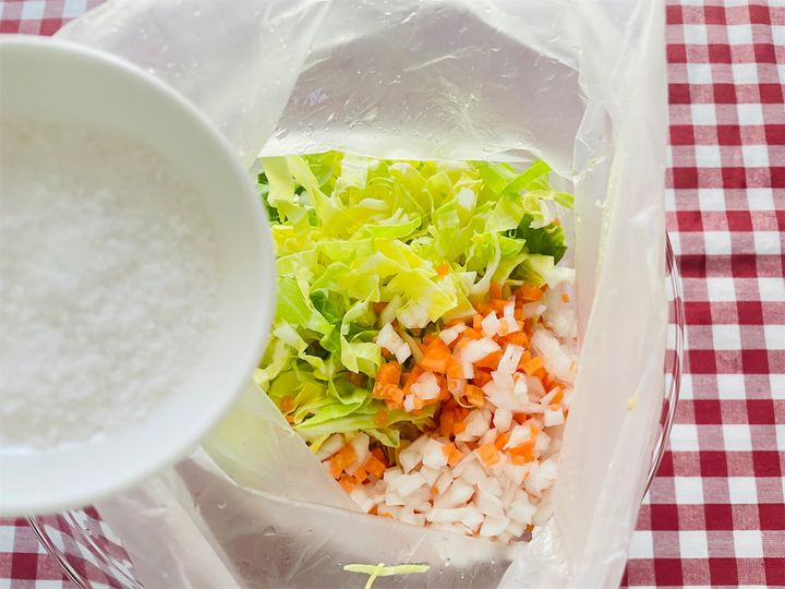 2. ポリ袋に1と塩を入れて軽くもみ、冷蔵庫で10分おく。
