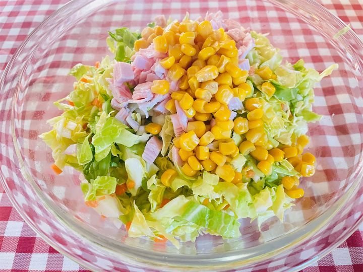 4. ボウルで[A]を混ぜ、3とハム、コーンを入れて混ぜ合わせる。