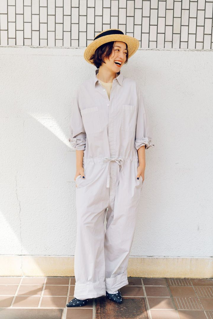 やさしいライトグレーのオールインワンは、薄手のコットン素材だから腰巻きスタイルもキマリやすい。パールやパンプスでレディな要素を加えるとより洒落た雰囲気に。