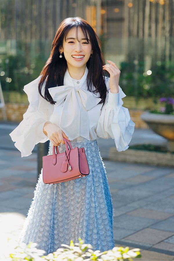 クリーンな白ブラウスで、糖度高めな大ぶりのボウタイをさらりと取り入れて。顔まわりが華やぐことで、美人オーラが急上昇!