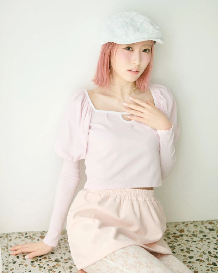 ハンチング 5,500円/kaorinomori(OVERRIDE ルミネエスト新宿)パフそでトップス 14,080円/lilLilly(lilLilly TOKYO)ピンクスカート 9,600円/mieya mieyaレースフレアーパンツ 3,959円/W♥C パール×ゴールドネックレス 550円/ラティス