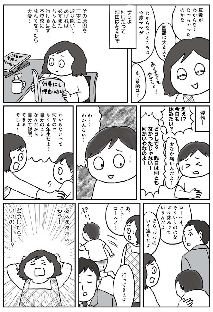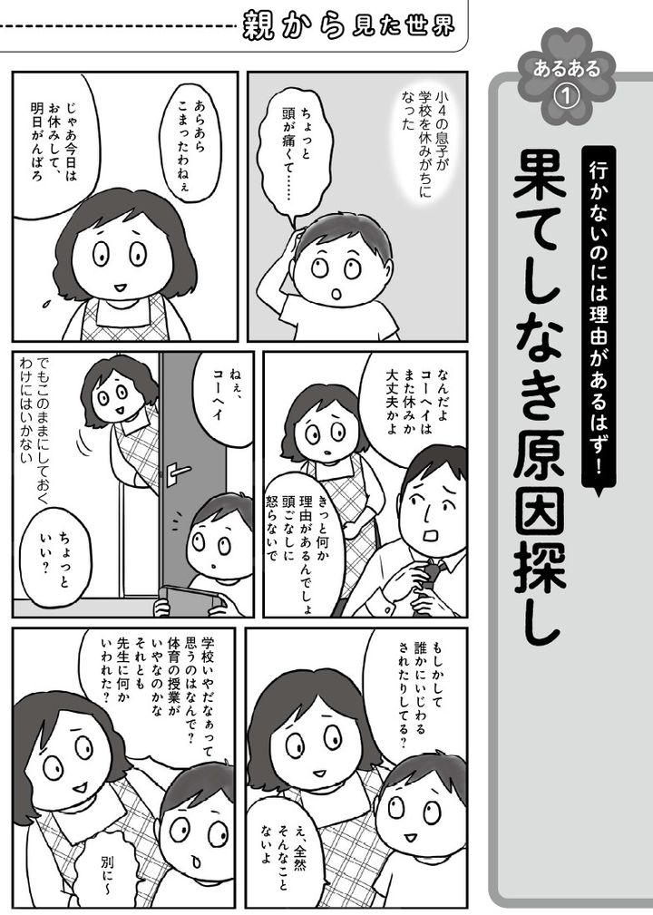 我が子に「学校に行きたくない」と言われてまず親が思うのは「なぜ?」ということではないでしょうか。学校で何か嫌なことがあるならば助けたい。そのためにも原因を突き止めなくては…。まずはそんな親の心の動きをマンガから見ていきましょう。